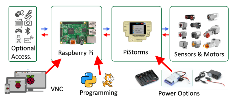 Jedná sa o programovateľnú nadstavbu (shield) pre mikropočítače Raspberry (A+, B+, Pi 2, Pi 3), ku ktorej sa dajú pripojiť 4 senzory a 4 motory z Lego Mindstorms NXT a EV3. Samozrejme má prístup k zariadeniam pre Raspberry (USB, audio aj kamera). Má zabudovaný 2,4´´ farebný LCD dotykový displej so stylusom. K internetu sa dá pripojit káblom alebo pomocou wifi (treba dokúpiť modul). Ovládateľný a programovateľný je pomocou počítača, tabletu alebo aj mobilu prostredníctvom VNC. PiStorms umožňuje aj zber a zobrazovanie rôznych dát. Lego nie je súčasťou PiStorms, Raspberry je súčasťou len Express kitu.